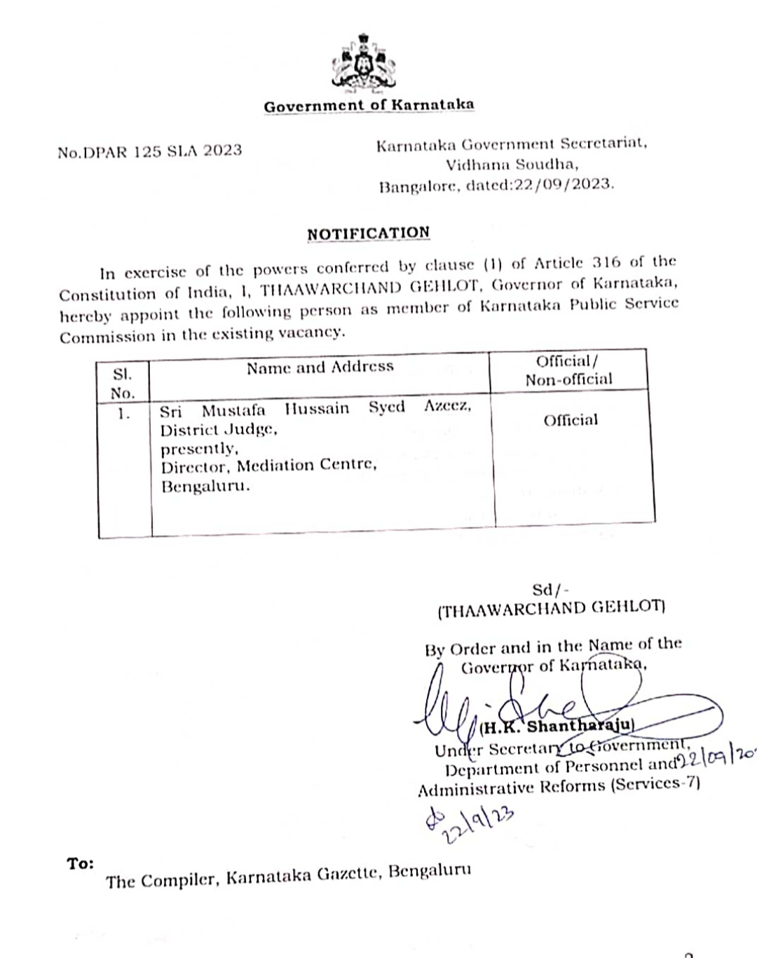 ಕರ್ನಾಟಕ ಲೋಕಸೇವಾ ಆಯೋಗದ ಸದಸ್ಯರಾಗಿ ಮುಸ್ತಫಾ ನೇಮಕ.