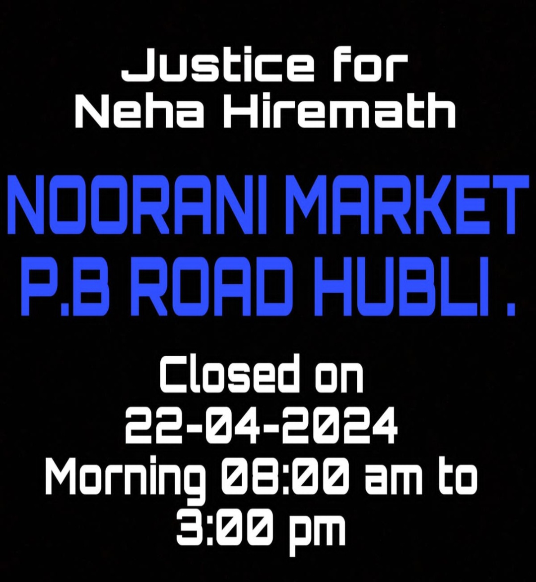 ಜಸ್ಟಿಸ್ ಫಾರ್ ನೇಹಾ. ಸೋಮವಾರ ಹುಬ್ಬಳ್ಳಿ ನೂರಾನಿ ಮಾರ್ಕೆಟ ಸಹ ಬಂದ್
