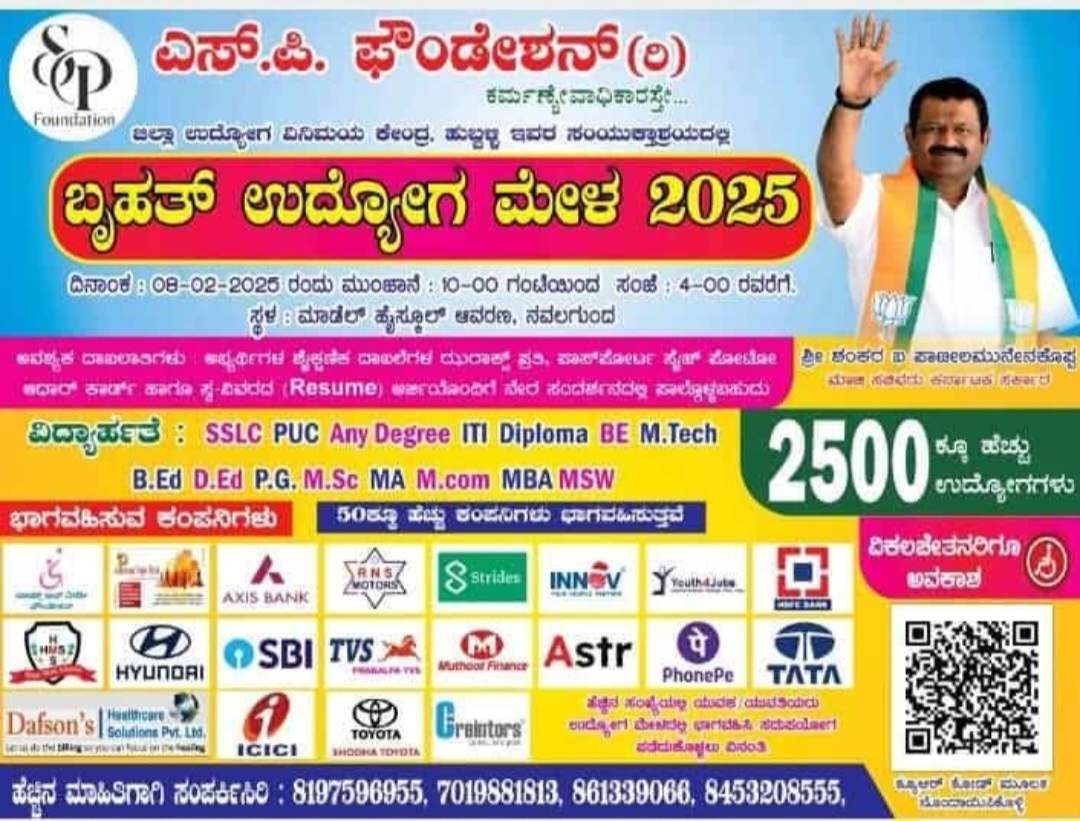ನವಲಗುಂದದಲ್ಲಿ ಬೃಹತ್ ಉದ್ಯೋಗ ಮೇಳ. ನವಲಗುಂದ ಕ್ಷೇತ್ರದ ಯುವಕರ ನೆರವಿಗೆ ಬಂದ ಶಂಕರ ಪಾಟೀಲ