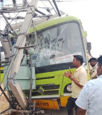 ನಿಯಂತ್ರಣ ಕಳೆದುಕೊಂಡ ಚಾಲಕ, ವಿದ್ಯುತ್ ಕಂಬಕ್ಕೆ ಗುದ್ದಿದ ಬಸ್ಸು